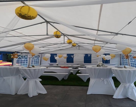 | Partytent 4x3 m. | € 50,00 | Statafel (doorsnee 85 cm) | € 6,00 | Buffettafel (1,75x0,80m.) | € 7,50 |